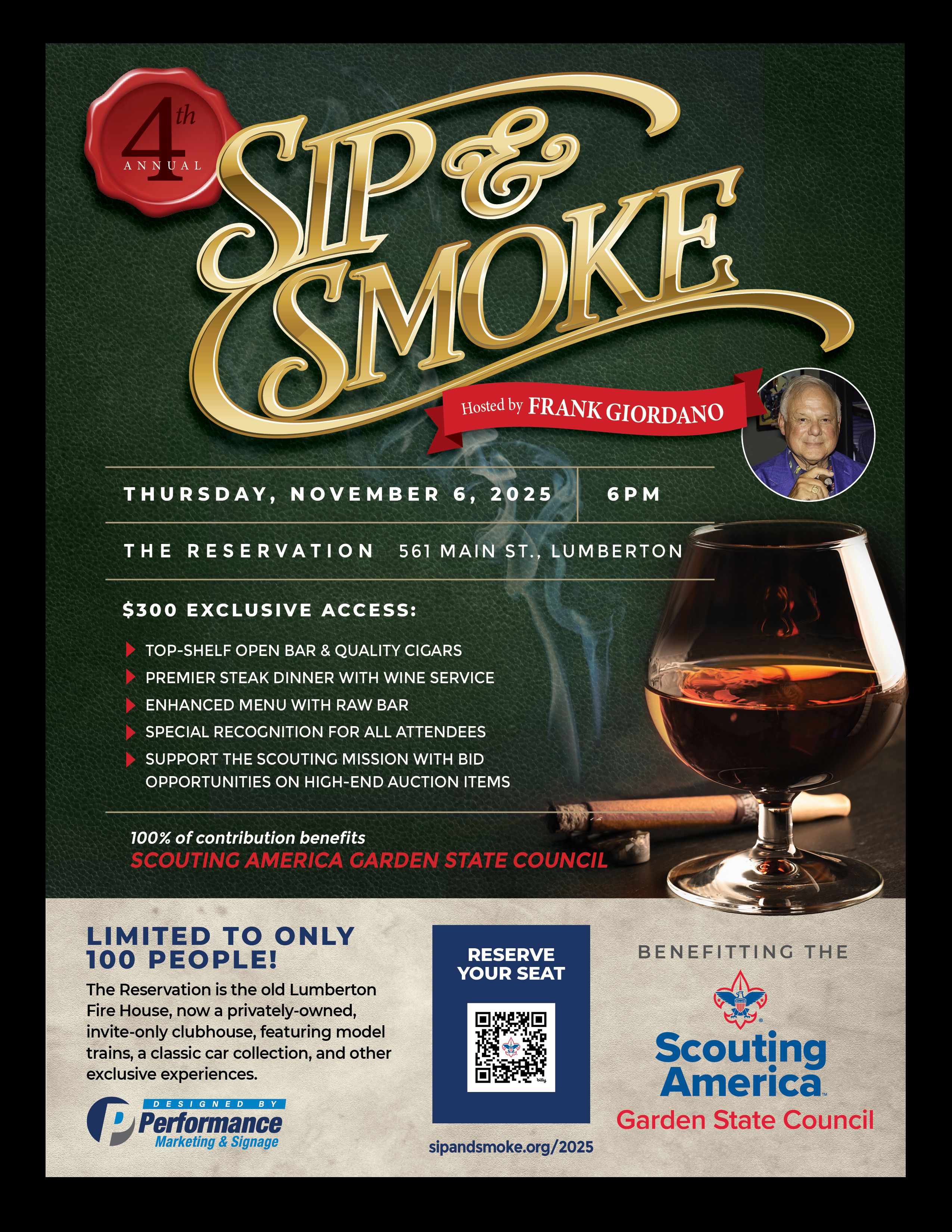 The 4th annual Sip and Smoke, hosted by Frank Giordano, is an exclusive event to benefit the programs of Scouting America Garden State Council.